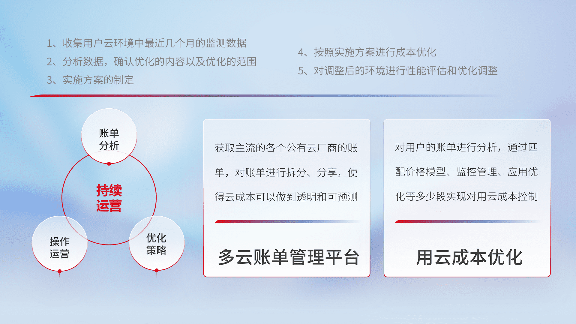 通过多云纳管,,,,以统一的资源数据模型把客户的云资源进行抽象和封装,,,,进而实现对多云资源的统一操作,,,,保障云资源管理的可靠性、、稳定性与可用性。。。。量身定制化运维内容,,配置、、开发运维、、、、补丁管理、、、备份、、、监控、、、、认证和访问管理、、、、审计和日常巡检等,,,保障在用云过程中的可靠度,,,,稳定度以及高可用率。。